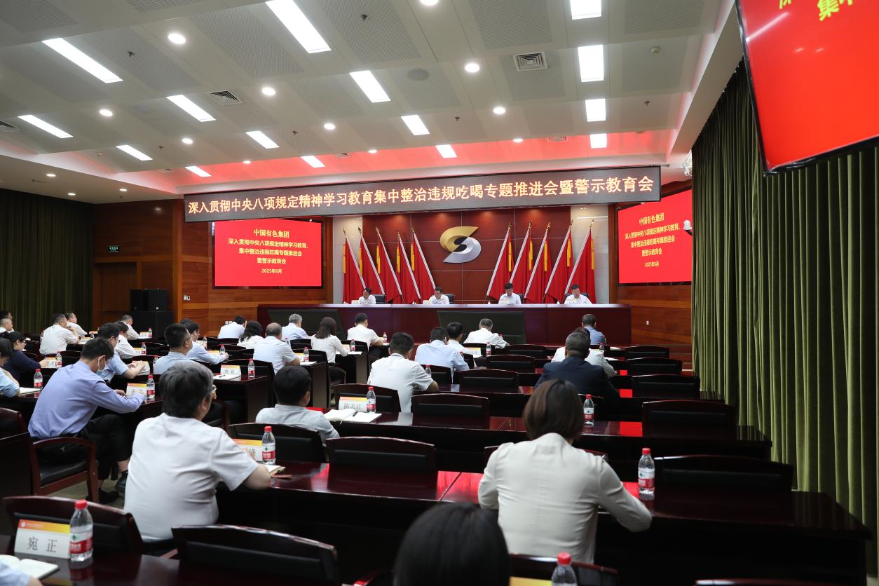 6月18日,中國有色集團黨委召開深入貫徹中央八項規定精神學習教育、集中整治違規吃喝專題推進會暨警示教育大會,再學習再領會習近平總書記關于加強黨的作風建設的重要論述,貫徹落實國務院國資委黨委國資央企集中整治違規吃喝專題推進會精神,集中通報典型案例,開展警示教育,對全系統開展集中整治違規吃喝進行專題部署。集團公司黨委書記、董事長文崗主持會議并講話,黨委委員、總會計師安宜傳達習近平總書記關于加強黨的作風建設的重要論述及國資委黨委會議精神,黨委委員、紀委書記、學習教育工作專班主任徐鋒傳達中央層面公開通報的違規吃喝典型案例并通報集團公司查處的違反中央八項規定精神典型案例。大會還組織集中觀看了有關專題警示教育片。