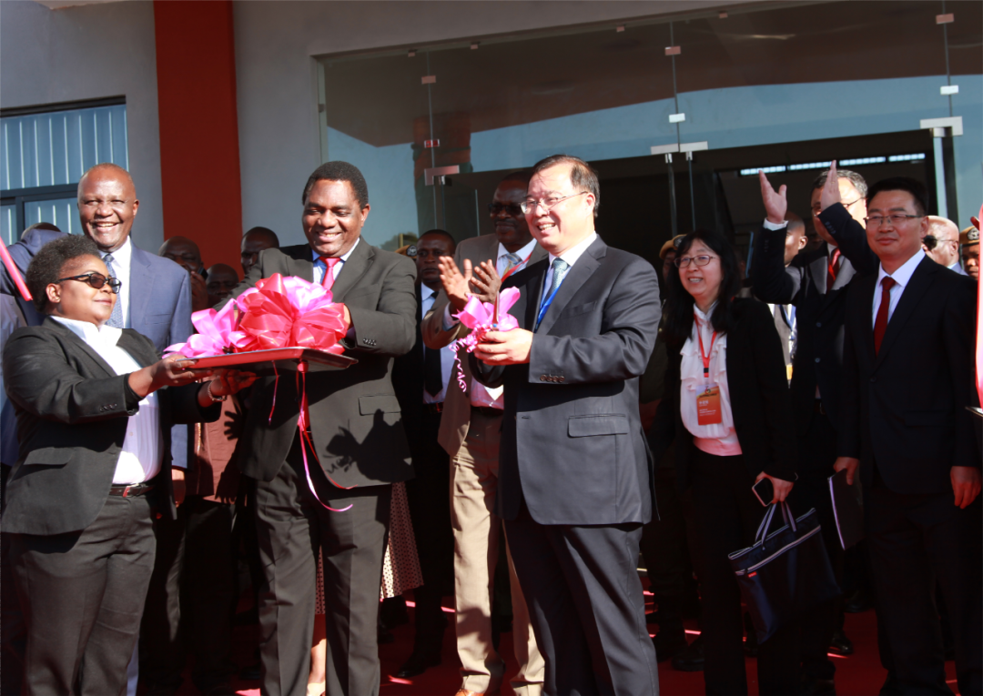 中贊職院新校區竣工剪彩儀式為論壇拉開序幕。希奇萊馬總統、中國有色集團董事長奚正平共同為中贊職院新校區竣工剪彩。